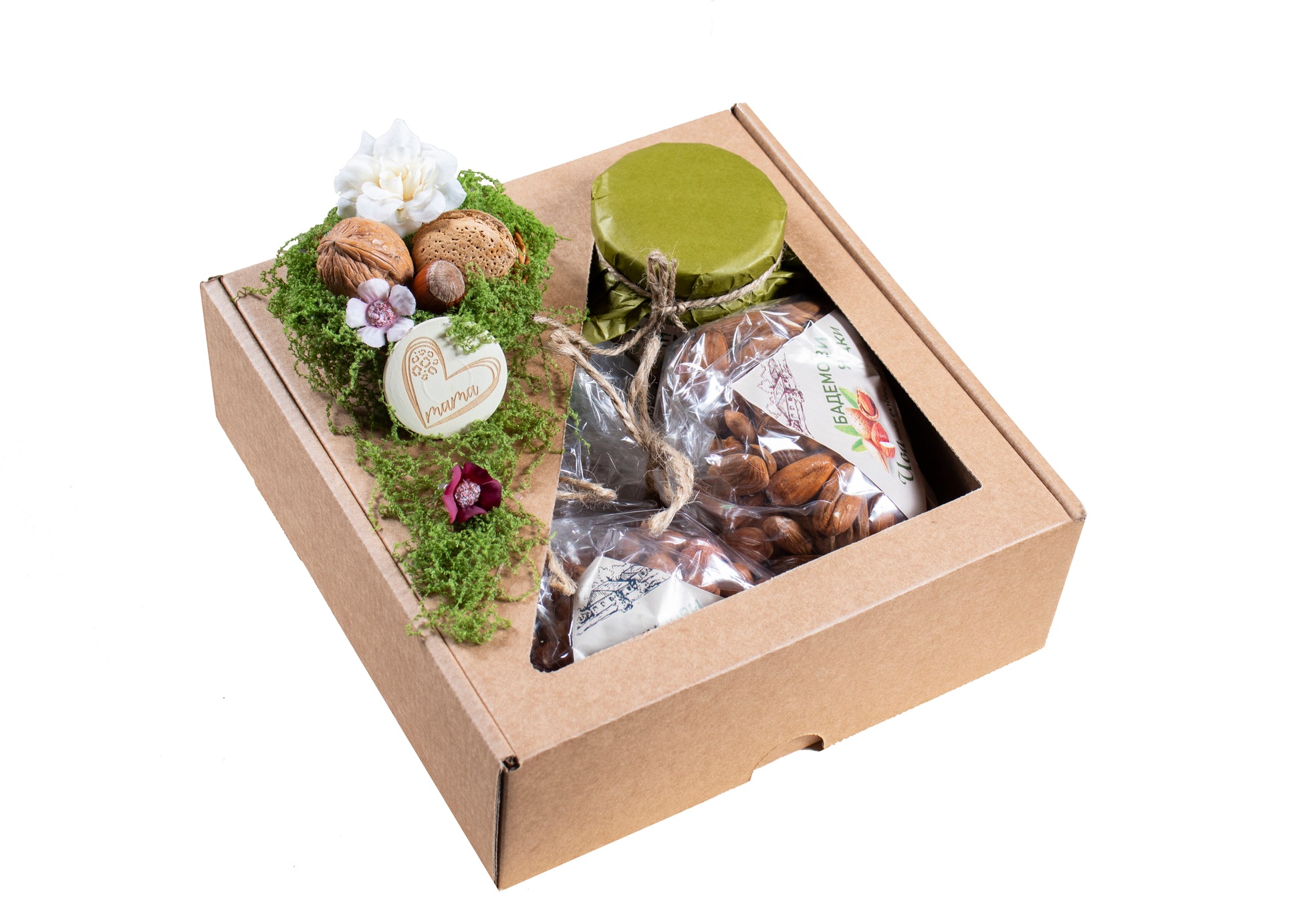Орехови ядки 0.200 кг, Бадемови ядки 0.200 кг, Лешникови ядки 0.200 кг, Бадемов или лешников тахан 0.170 кг (по избор) и уникална ръчно изработена украса.
