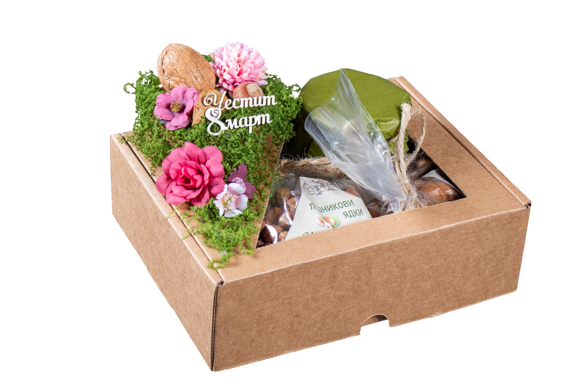 Орехови ядки 0.100 кг, Бадемови ядки 0.100 кг, Лешникови ядки 0.100 кг, Орехов тахан 0.170 кг и уникална ръчно изработена украса.